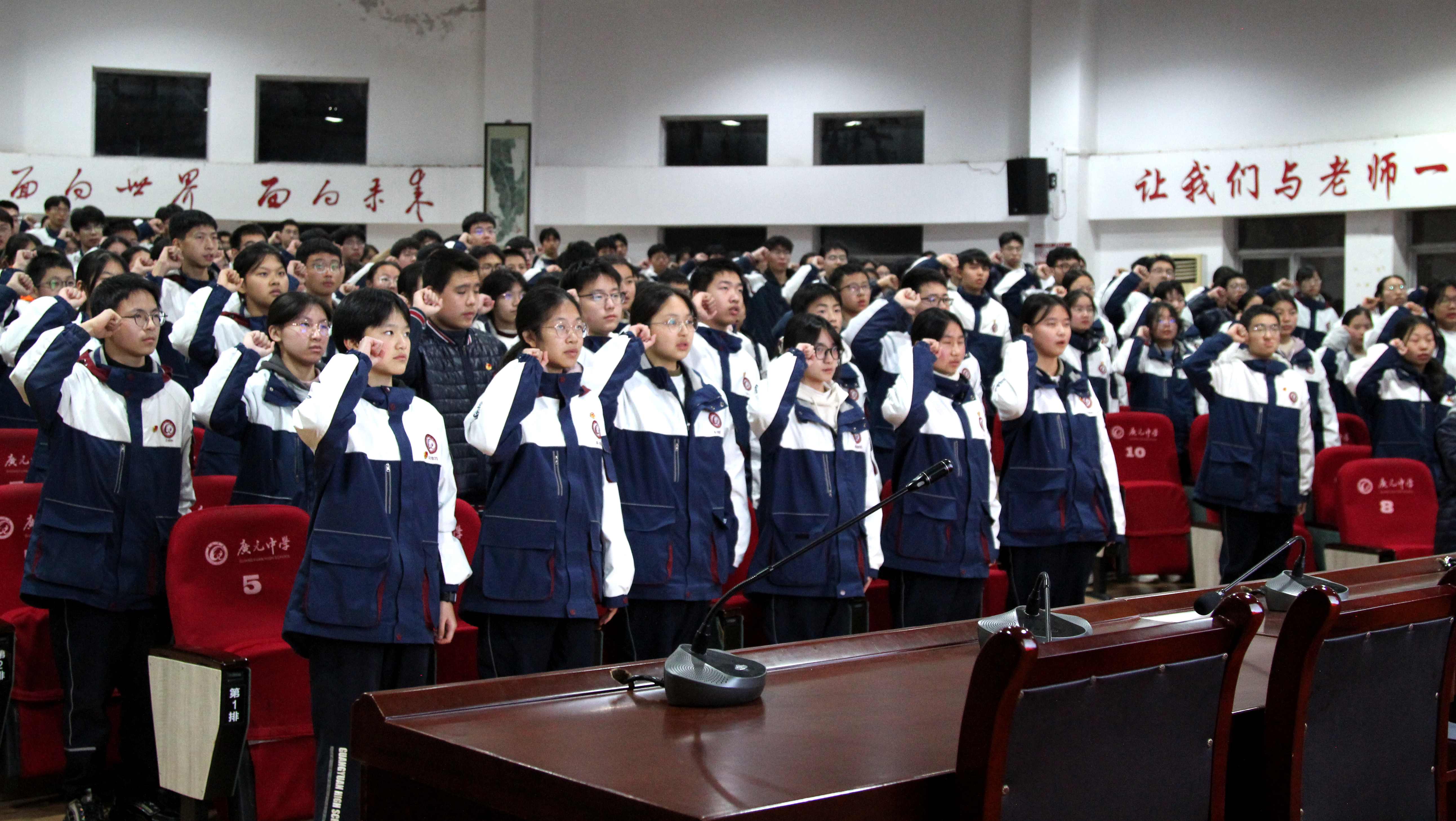 仪式第四项,庄严宣誓。在高2023级5班白玥兮同学的领誓下,新老团员共同举起右拳,“我志愿加入中国共产主义青年团,坚决拥护中国共产党的领导……”面向鲜艳的团旗庄严宣誓。铿锵有力的誓言回荡在报告厅内,字字千钧,既彰显着向团组织靠拢的坚定决心,更传递着新时代青年的责任担当。宣誓礼成,新团员们的使命感与责任感愈发强烈,他们将把铮铮誓言融入日常学习生活,以团员标准严格要求自己,用奋斗擦亮青春底色。